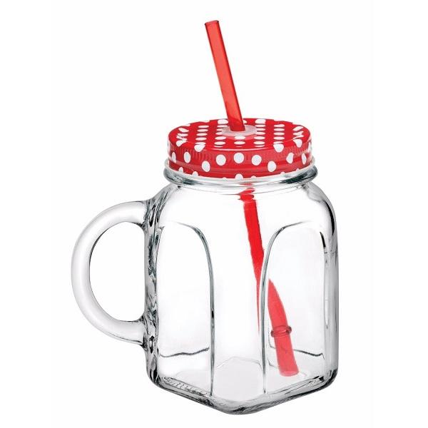 Банка для коктейля 450 мл. с красной крышкой и красной трубочкой, с ручкой Турция /1/12/