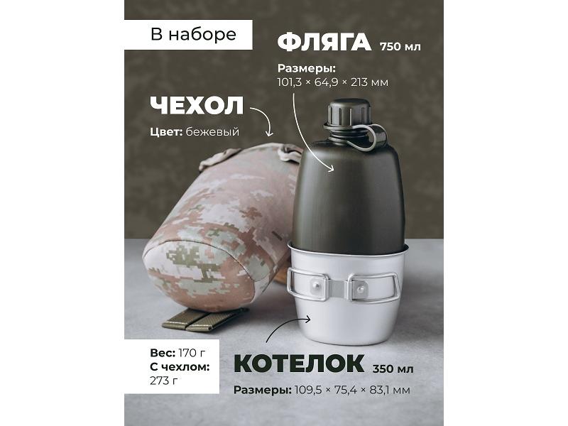 string(378) "101,3*64,9*213 (фляга 750мл) 109,5*75,4*83,1 (котелок 350мл), вес 170гр, с чехлом 273гр. Фляга предназначена для содержания питьевой воды, котелок для приготовления кипятка. Материал: фляга полиэтилен, котелок: пищевой алюминий.
