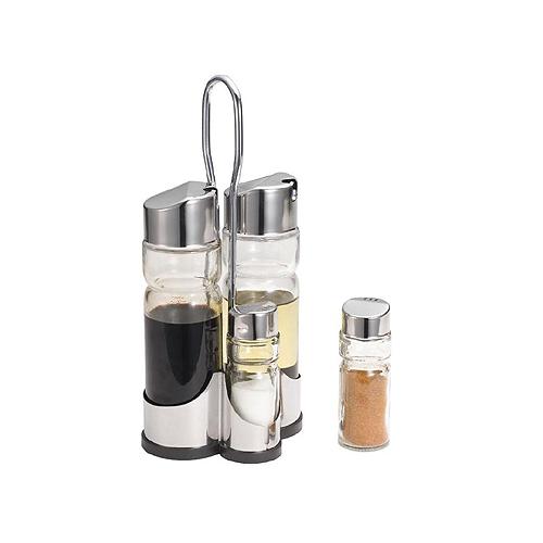Набор предметов для специй, в который входит солонка, перечница, емкости для масла и уксуса.
