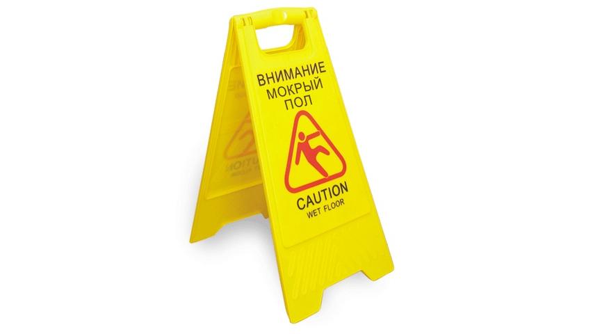 Также необходимо использовать знаки при проведении влажной уборки. Сочетание ярких цветов (желтый, черный, красный) позволяет увидеть такие раскладные таблички на большом расстоянии.