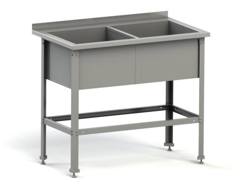 Ванна моечная двухсекционная с бортом MGsteel. В общем корпусе располагаются две ёмкости, что допускает одновременное выполнение двух этапов технологической цепочки. Например, допускается совмещение размораживания и мытья продуктов, помывка и ополаскивание посуды, санитарная обработка с последующим мытьём. Моечные секции сварные. Изготавливаются из отдельных частей с применением сварки. Каркас разборный, изготовлен из нержавеющей стали. Стойки снабжены регулируемыми опорами из ударопрочного пластика. Пристенный борт без отверстия под смеситель.